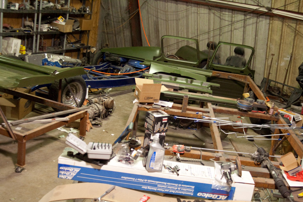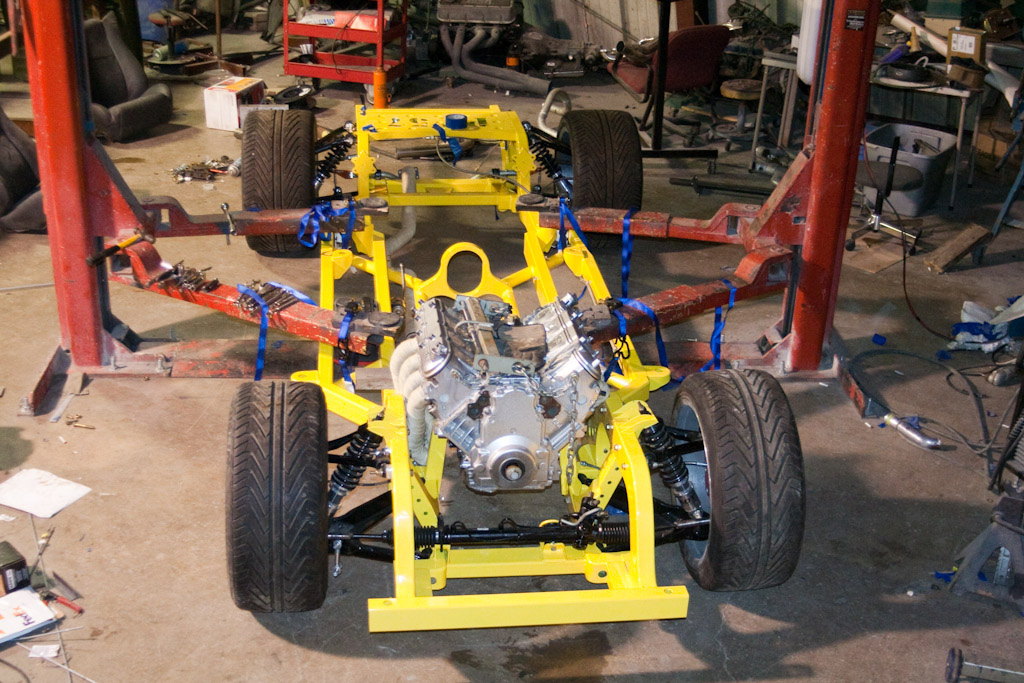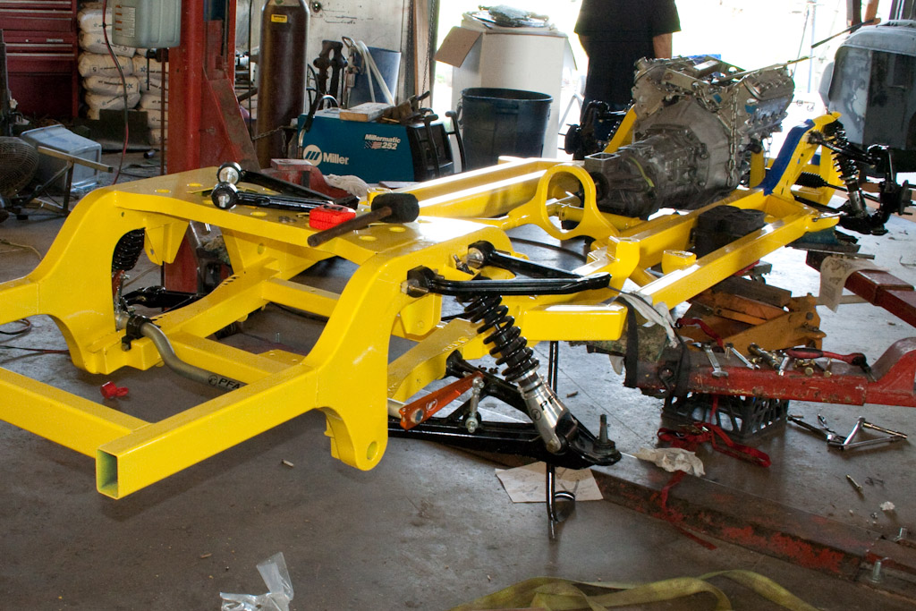 The frame just came back from the powder coat. We immediately started bolting on the suspension.
