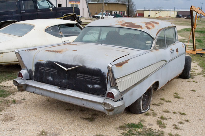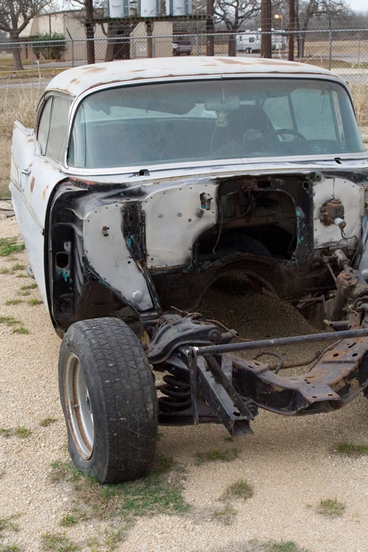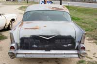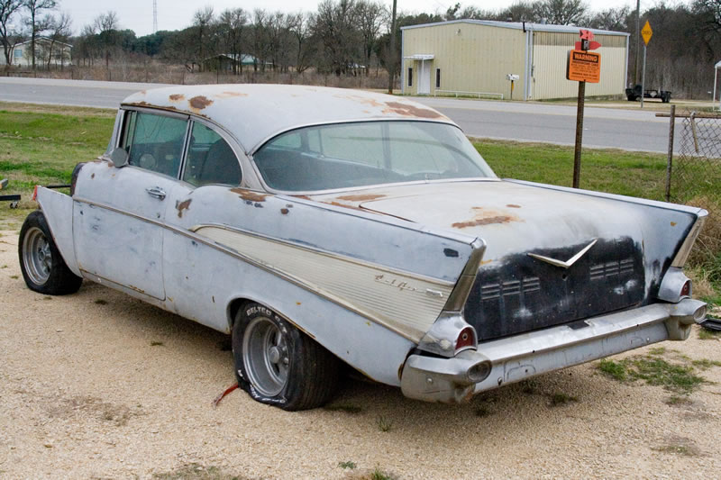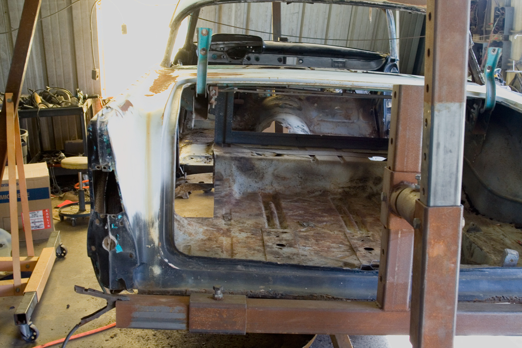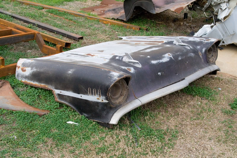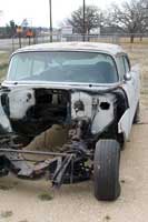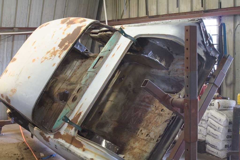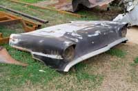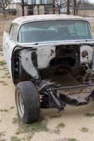 The Body of our 57 came from a gentleman who had had the car for more than 30 years. The car had moved from indoor storage to indoor storage and only spending minimal amounts of time outside. So when he decided he wanted to sell it we jumped on that deal like a fly on stink. So here’s the starting point for Project Metteor. They had tried to do a flip front end and it didn’t work out like they had planed so we’ll be converting it back into a traditional flip hood. We’ll be steeling the front end from one of our donor 57’s.