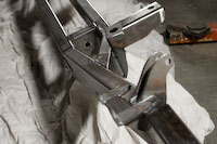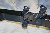 When you order a bare frame, un-painted and without powder coat, you will get the frame with all the body mounts and suspension mounts for your C4 suspension and your TriFive Chevy. You will also receive a transmission crossmember un-mounted; you will need to drill through the frame rail to mount the transmission crossmember as well as your bumper mounts. You will also get a nut and bolt kit (figure 3)consisting of all the bolts you will need to install your Corvette suspension onto your frame. The only fab work you’ll need to do is building your motor mounts, the stock corvette motor mounts will not work without firewall modifications. We clean off the stock motor mount (figure 4) and build a motor mount to clear what we need (figure 5 is a slotted SBC Mount) (figure 6 is our LS motor using a custom mount to the motor).