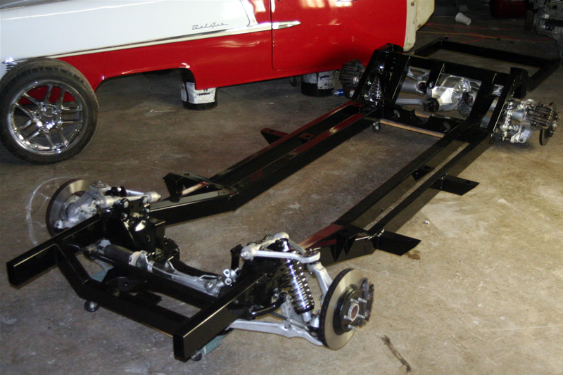Hot Rod Jim’s Tri Five C4 Rolling Chassis is the bare frame powder coated with a complete suspension only needing a few small touches to finish out and be ready to bolt your body and finish your build. Our Basic rolling chassis only needs brake lines and your TriFive of Choice. This Chassis requires No modifications to your original body. The only modifications required are on Nomads and Station Wagons to their gas tank. We simply remove the stock rear floor board and gas tank and replace them with the tank and floorboard section from a Sedan or Hard Top.